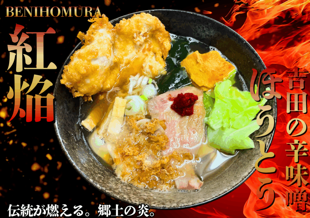 富士吉田名物「吉田のうどん」と、卓上調味料“すりだね”の魂を受け継ぐ、 新時代の辛味噌ほうとう。カツオと唐辛子を練り込んだ特製“辛味玉”を溶かせば、 スープが紅く染まり、郷土の香りが立ちのぼる。伝統と刺激が溶け合う、旨辛の赤い名峰。山梨の魂、ここに燃ゆ。